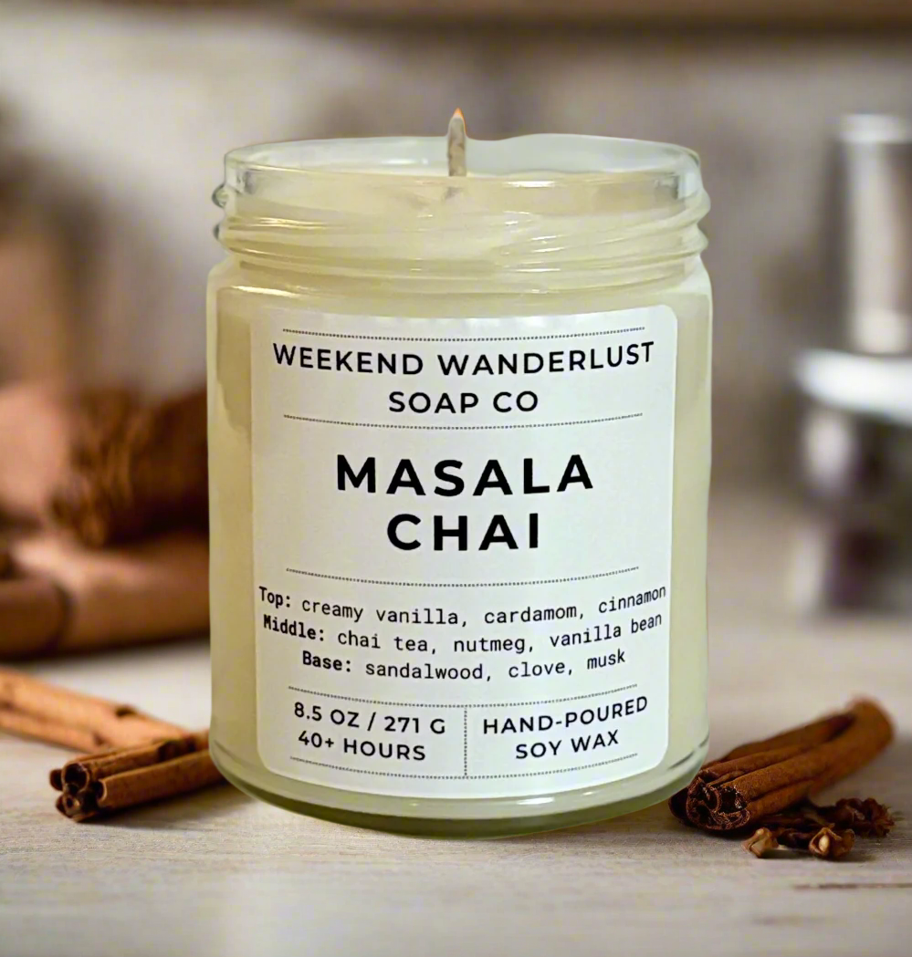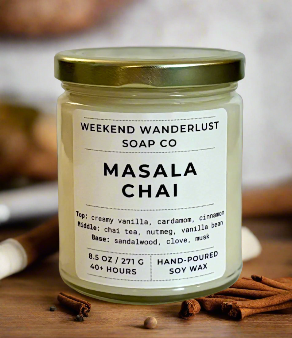 Immerse yourself in the warm and inviting aroma of our Masala Chai fragrance. This scent captures the essence of a cozy moment with a steaming cup of spiced chai, blending the rich notes of West Indian sandalwood, creamy vanilla, and chai tea with the warm spices of cardamom, cinnamon, clove, and nutmeg. A touch of vanilla bean and musk rounds out the fragrance, creating a comforting and nostalgic ambiance.