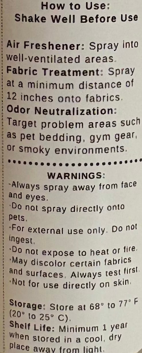 - Fabric Freshener: Spritz onto linens, towels, and clothing from a minimum distance of 12 inches to avoid oversaturation