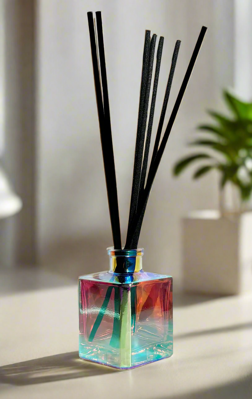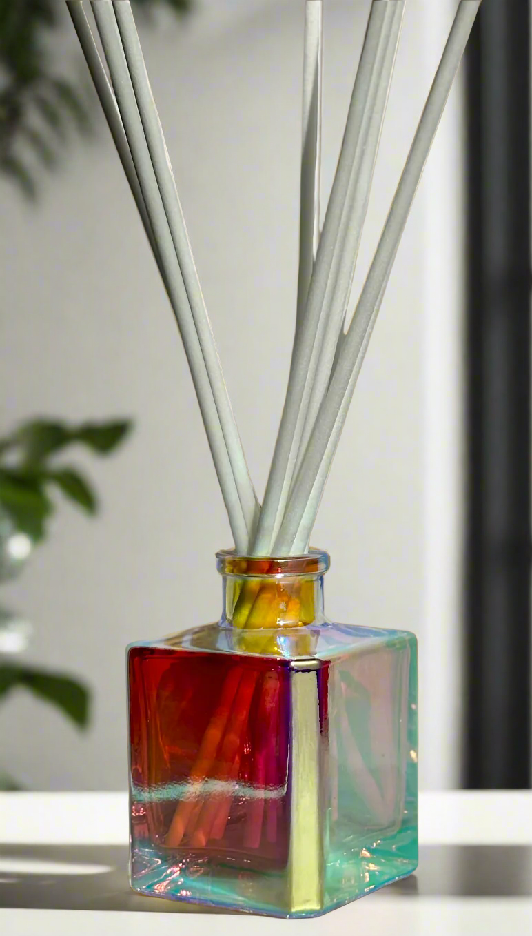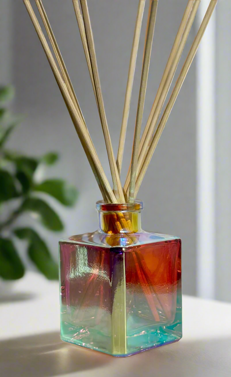 Elevate your home with the Prism Cube Reed Diffuser, a statement piece designed to captivate. Its iridescent coating shimmers with a mesmerizing spectrum of colors, shifting beautifully with the light. Crafted for both style and function, this diffuser provides a flame-free, low-maintenance way to fill your space with continuous fragrance, making it a luxurious and effortless addition to any room.