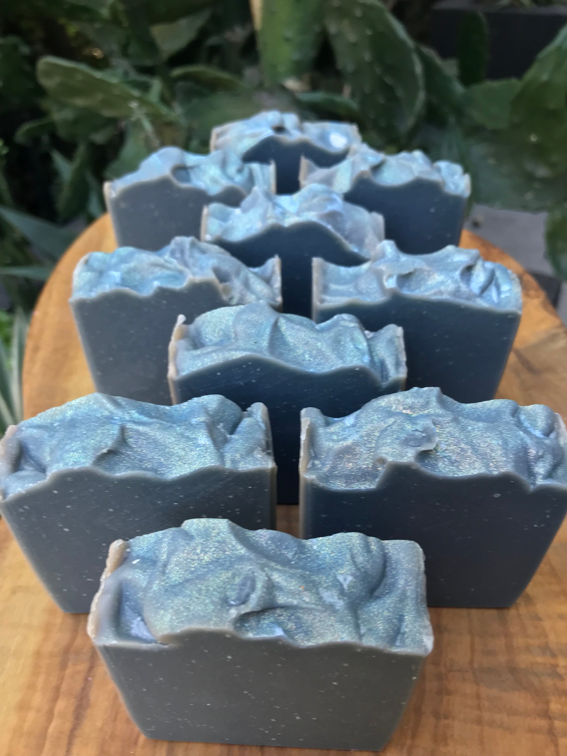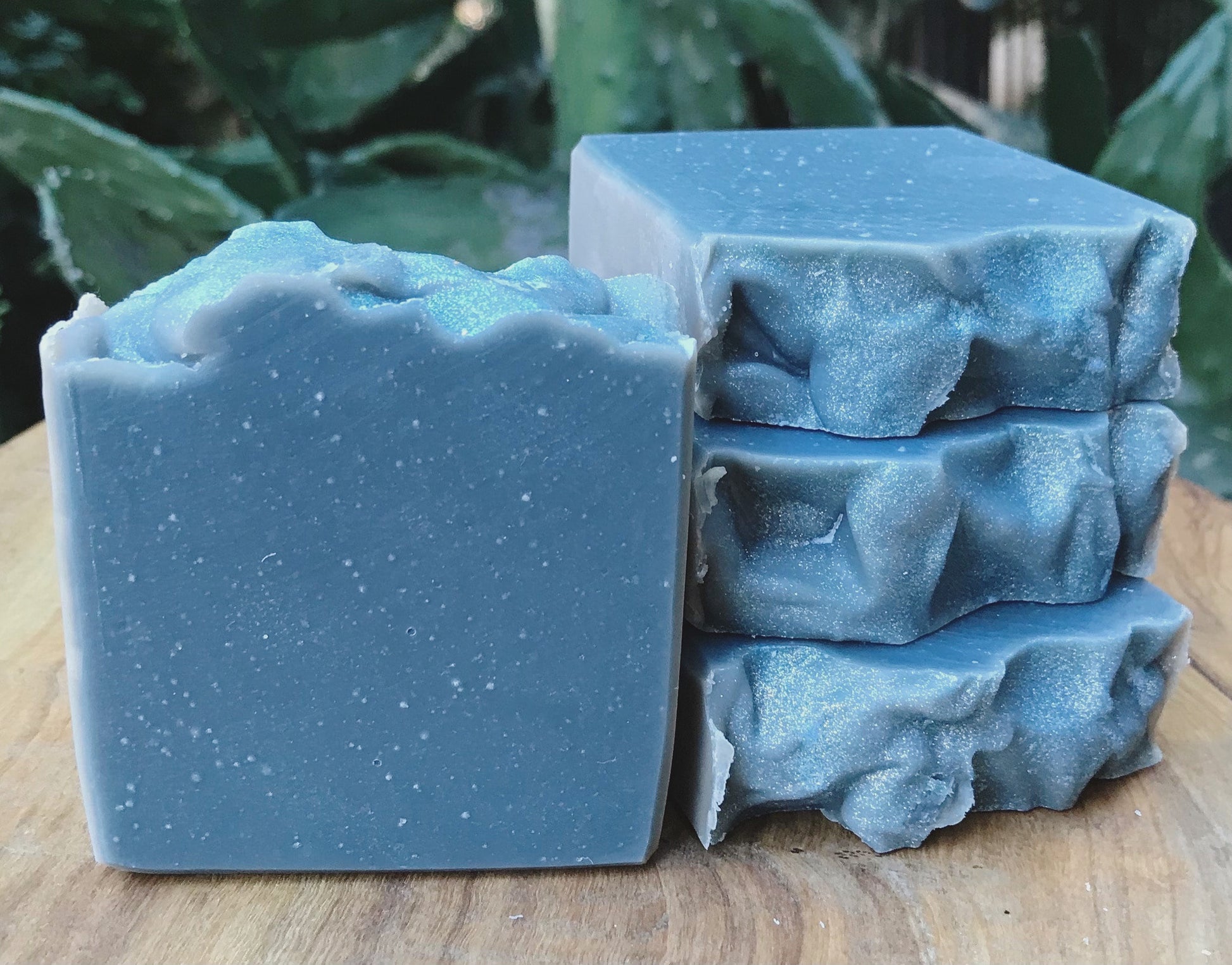 Ingredients: organic coconut oil, organic sustainable palm oil, canola oil, olive oil, grapeseed oil, distilled water, sodium hydroxide, sodium lactate, kaolin clay, fine pumice, fragrance, indigo powder, mica, biodegradable glitter