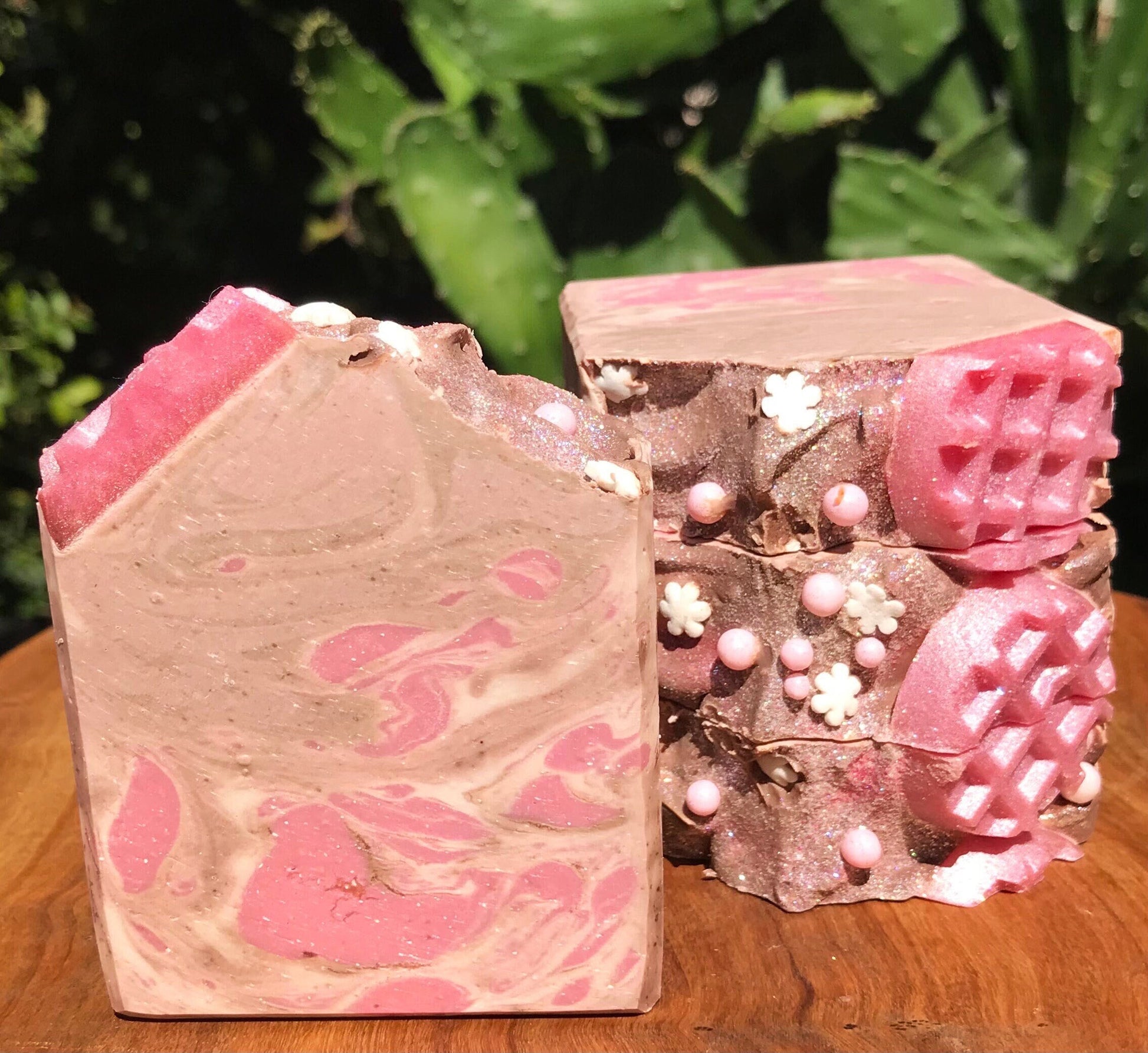 Experience the comforting aroma of freshly baked treats with our Artisan Sugar Cookie Soap. Handcrafted with care, this soap combines premium coconut and olive oils to create a rich, creamy lather that gently cleanses and moisturizes your skin. Each bar of soap is lovingly handmade and topped with adorable pink waffle cookies, adding a playful and charming touch to your bath routine. These cute decorations enhance the visual appeal of the soap and make it a delightful addition to your bathroom or a thoughtful gift for loved ones.