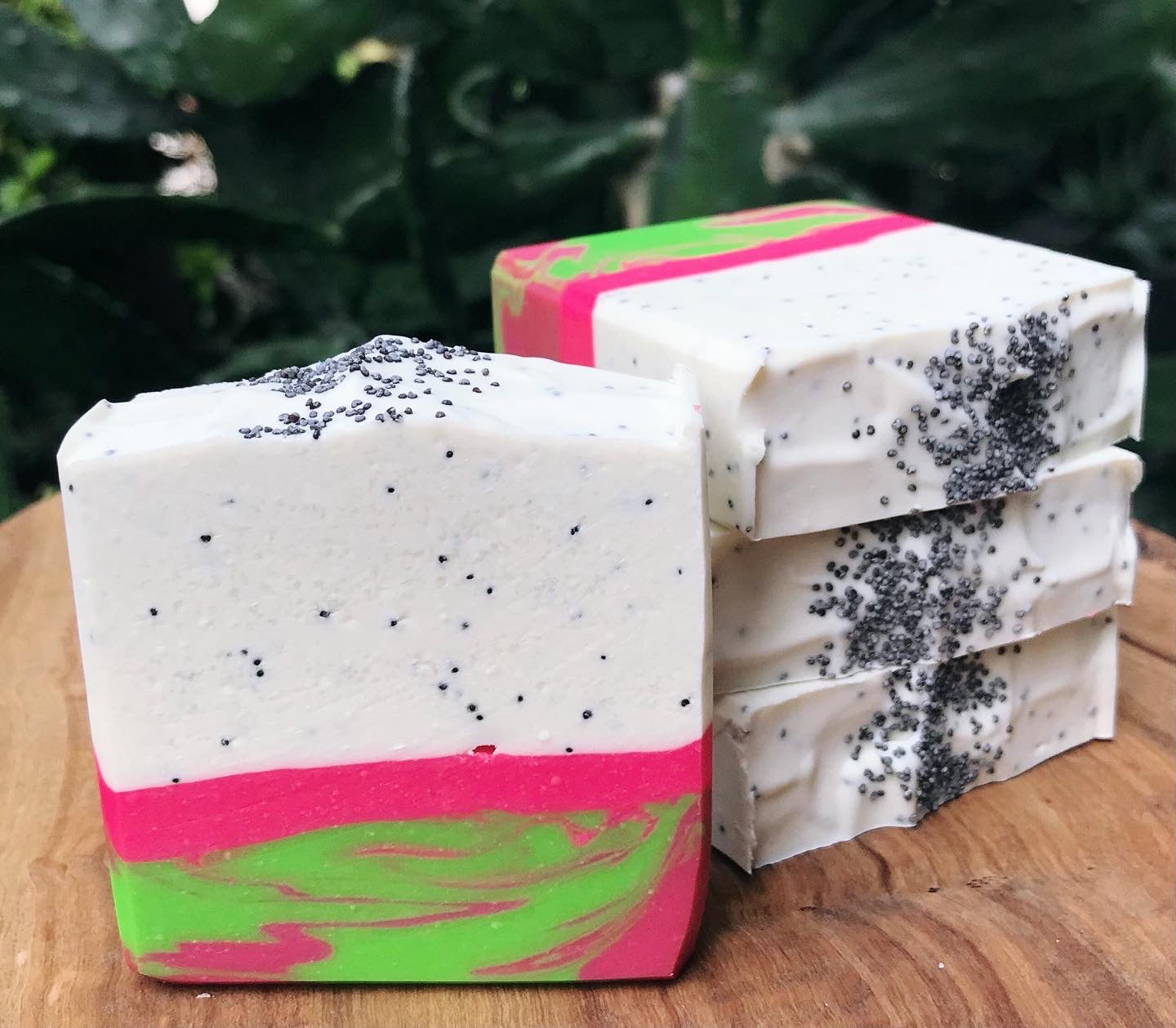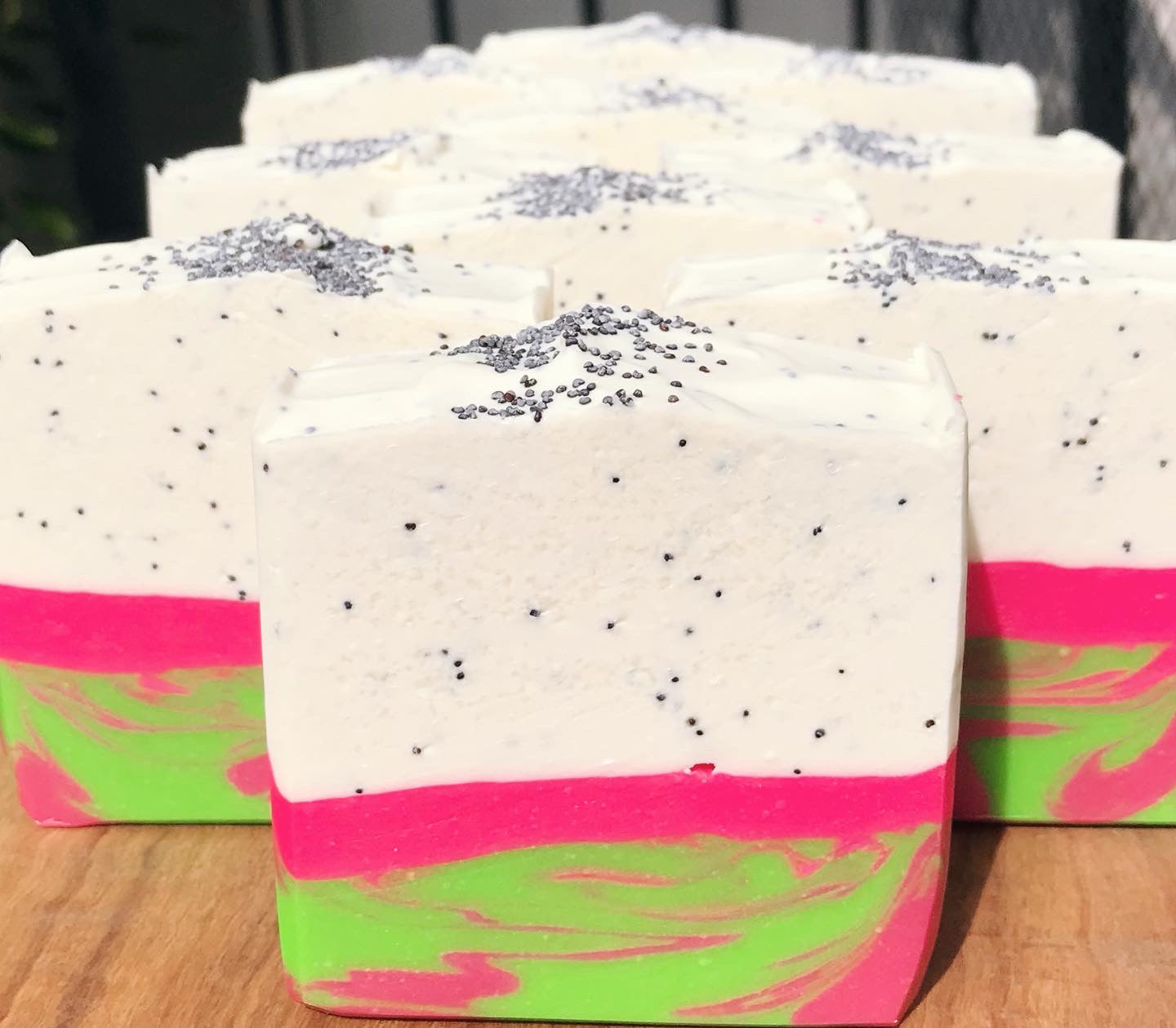 Ingredients: organic coconut oil, canola oil, olive oil, distilled water, grapeseed oil, sunflower oil, sodium hydroxide, palm kernel flakes, sodium lactate, fragrance, body safe oxide colorant, mica, kaolin clay, poppyseeds