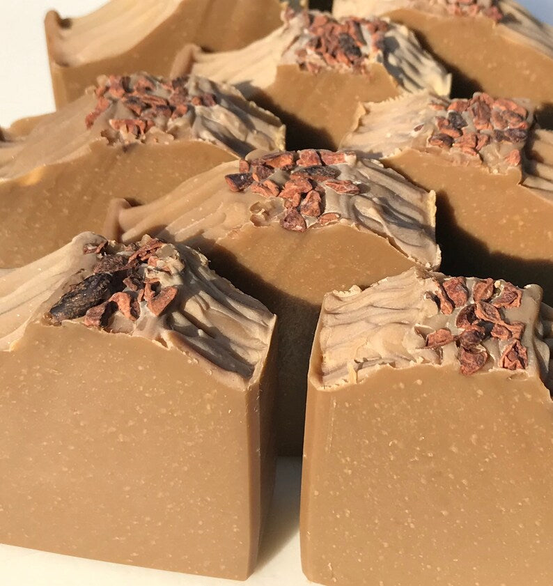 Ingredients: organic coconut oil, canola oil, distilled water, olive oil, grapeseed oil, palm kernel flakes, shea butter, kokum butter, sodium hydroxide, kaolin clay, sodium lactate, fragrance, mica, cocoa nibs