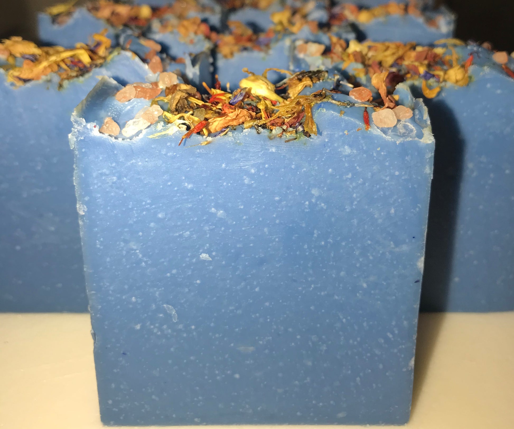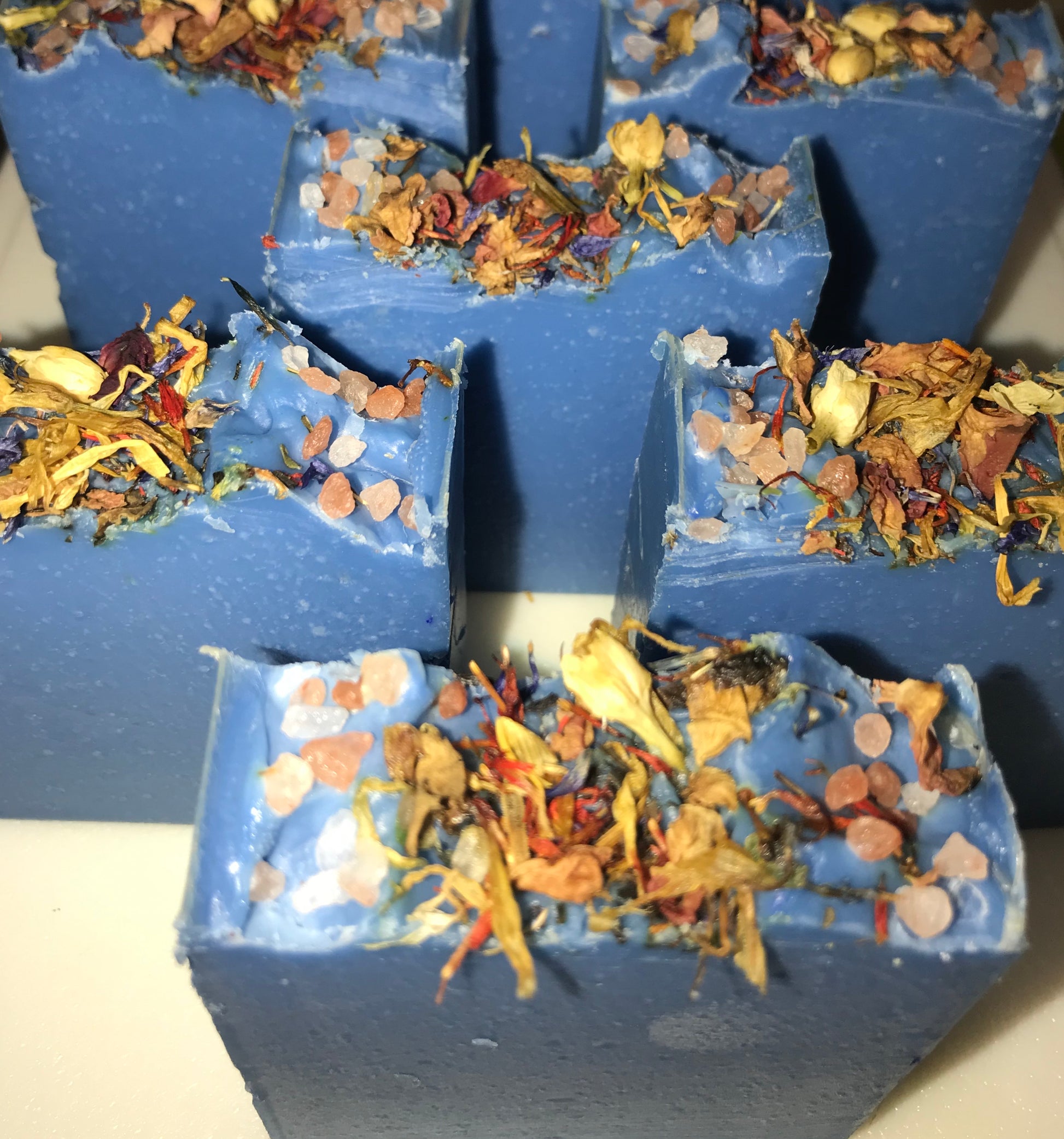 Ingredients: organic coconut oil, organic sustainable palm oil, castor oil, olive oil, canola oil, vitamin e, distilled water, sodium hydroxide, sodium lactate, fragrance, body safe oxide colorant, indigo powder, dried flowers, pink Himalayan salt
