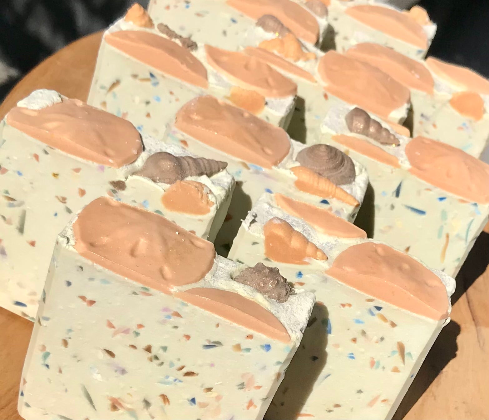 Our small batch Beach House handmade soap captures the essence of sandy beaches and coastal breezes with its enchanting tropical fragrance. Each bar is topped with adorable sand dollars and shells, making it a perfect seaside escape in your shower.