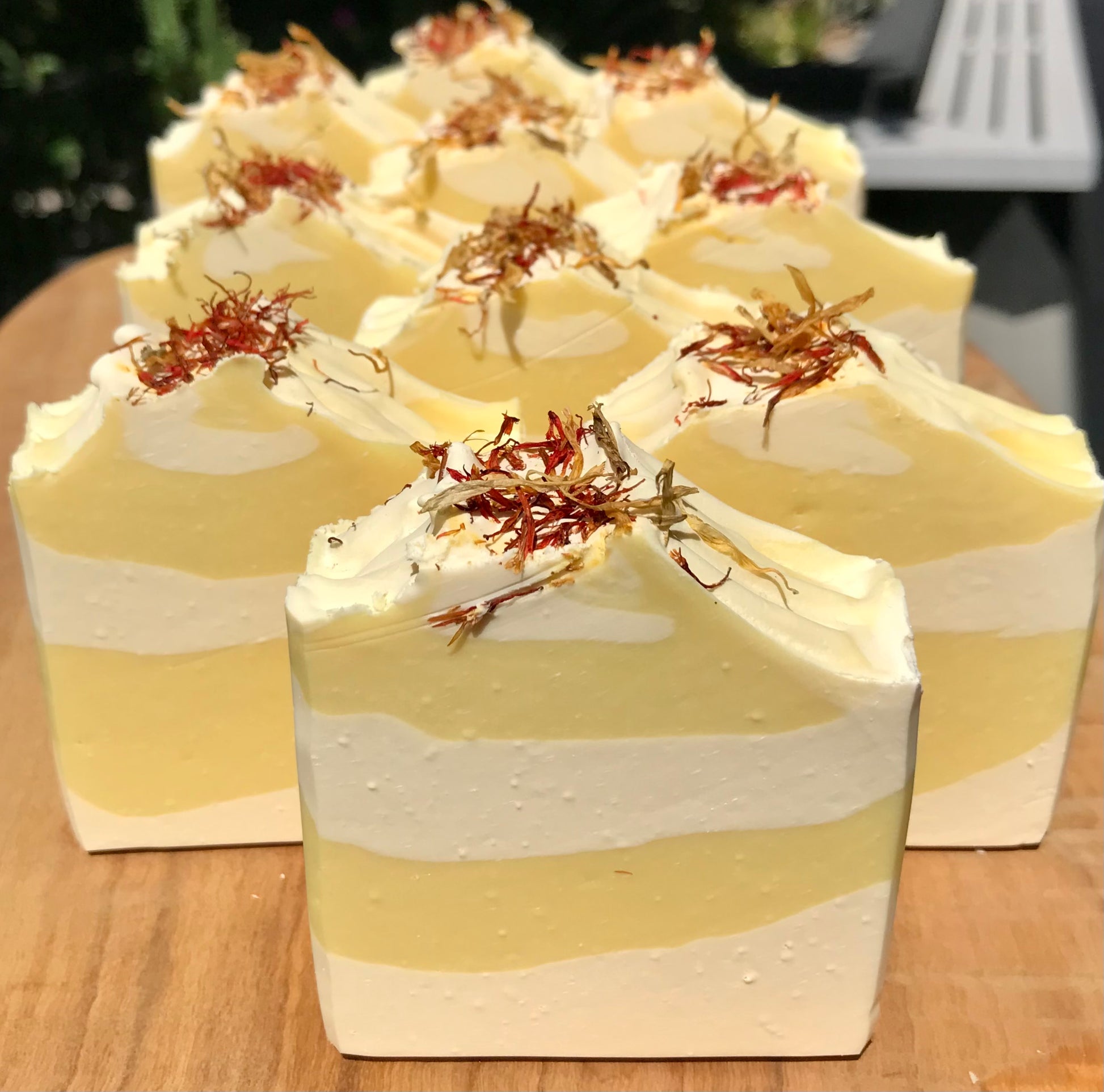 Ingredients: organic coconut oil, organic sustainable palm oil, canola oil, distilled water, olive oil, grapeseed oil, sunflower oil, sodium hydroxide, cocoa butter, fragrance, kaolin clay, body safe oxide colorant, mica, dried calendula, dried safflower