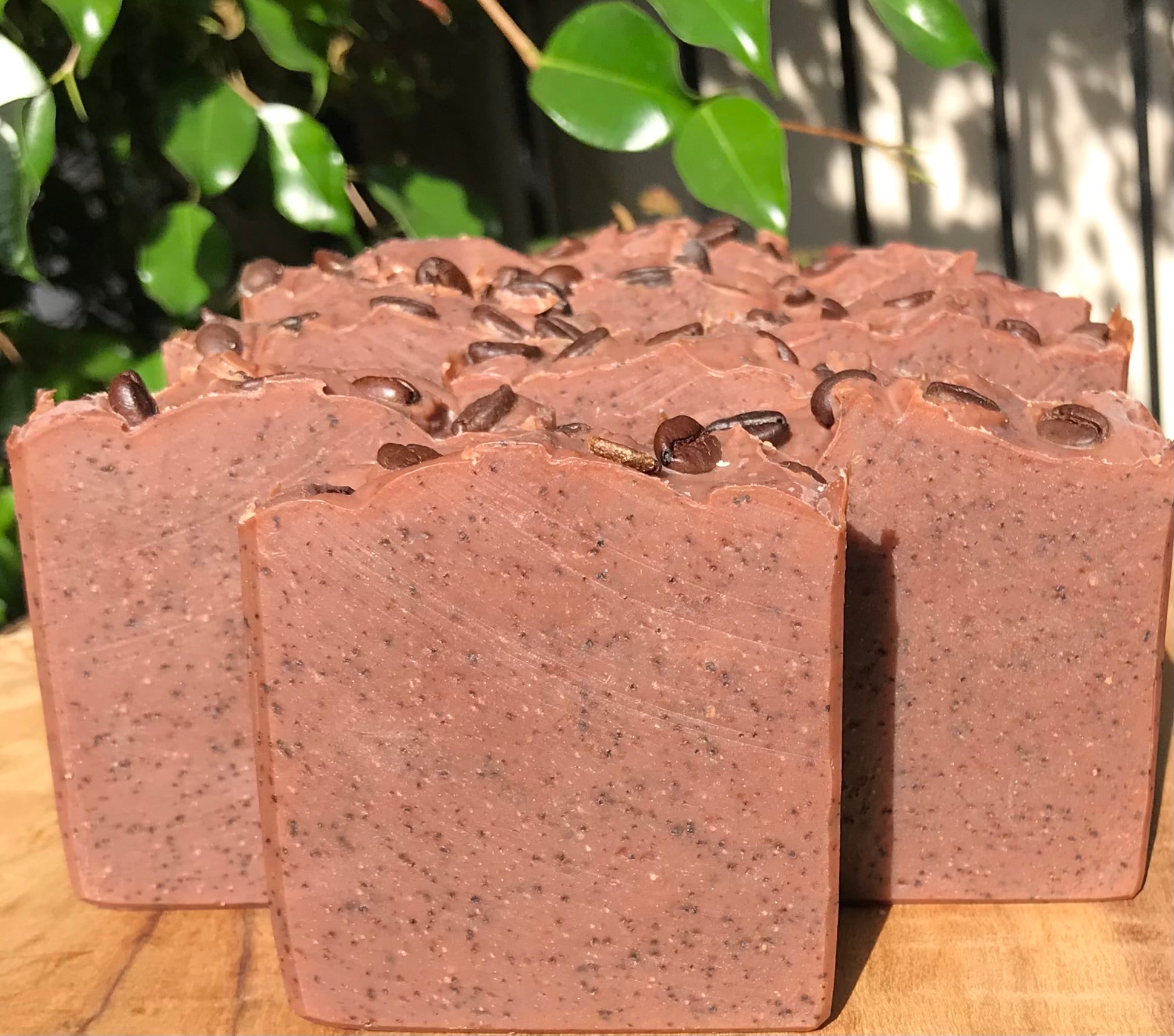 Ingredients: organic coconut oil, organic sustainable palm oil, canola oil, distilled water, olive oil, grapeseed oil, sunflower oil, sodium hydroxide, palm kernel flakes, sodium lactate, fragrance, mica, kaolin clay, ground coffee, coffee beans