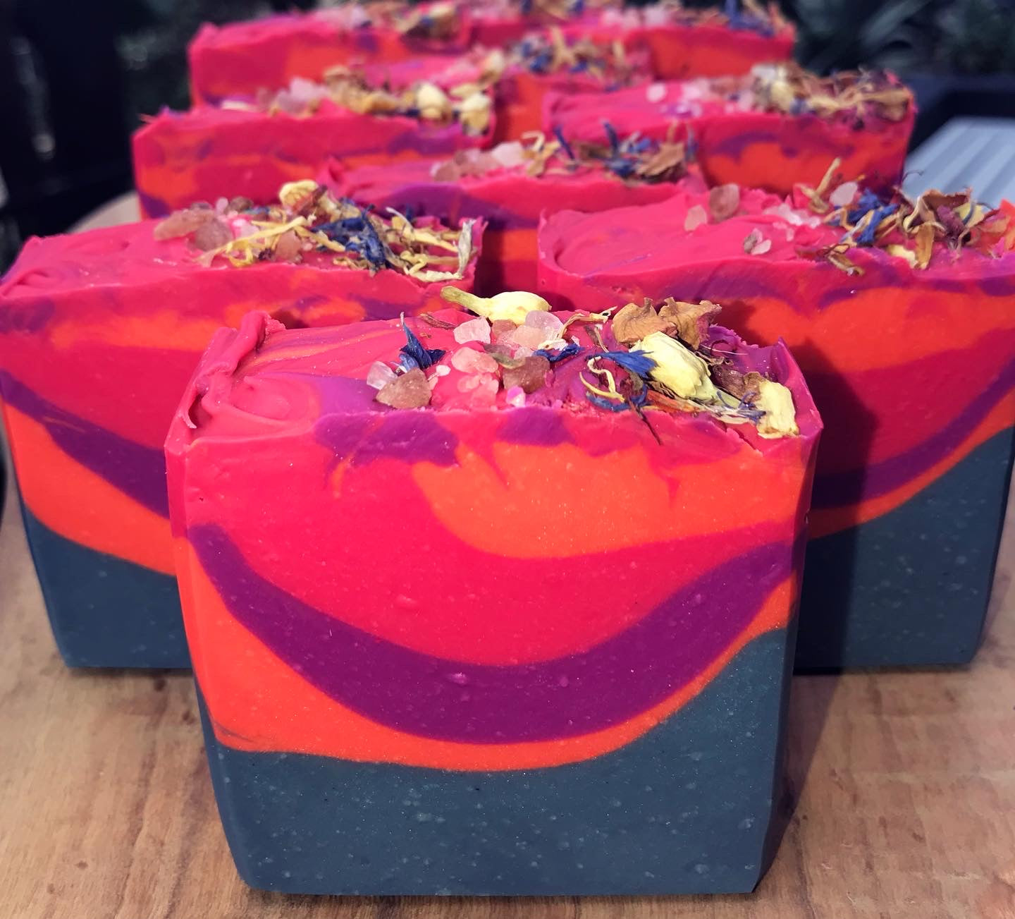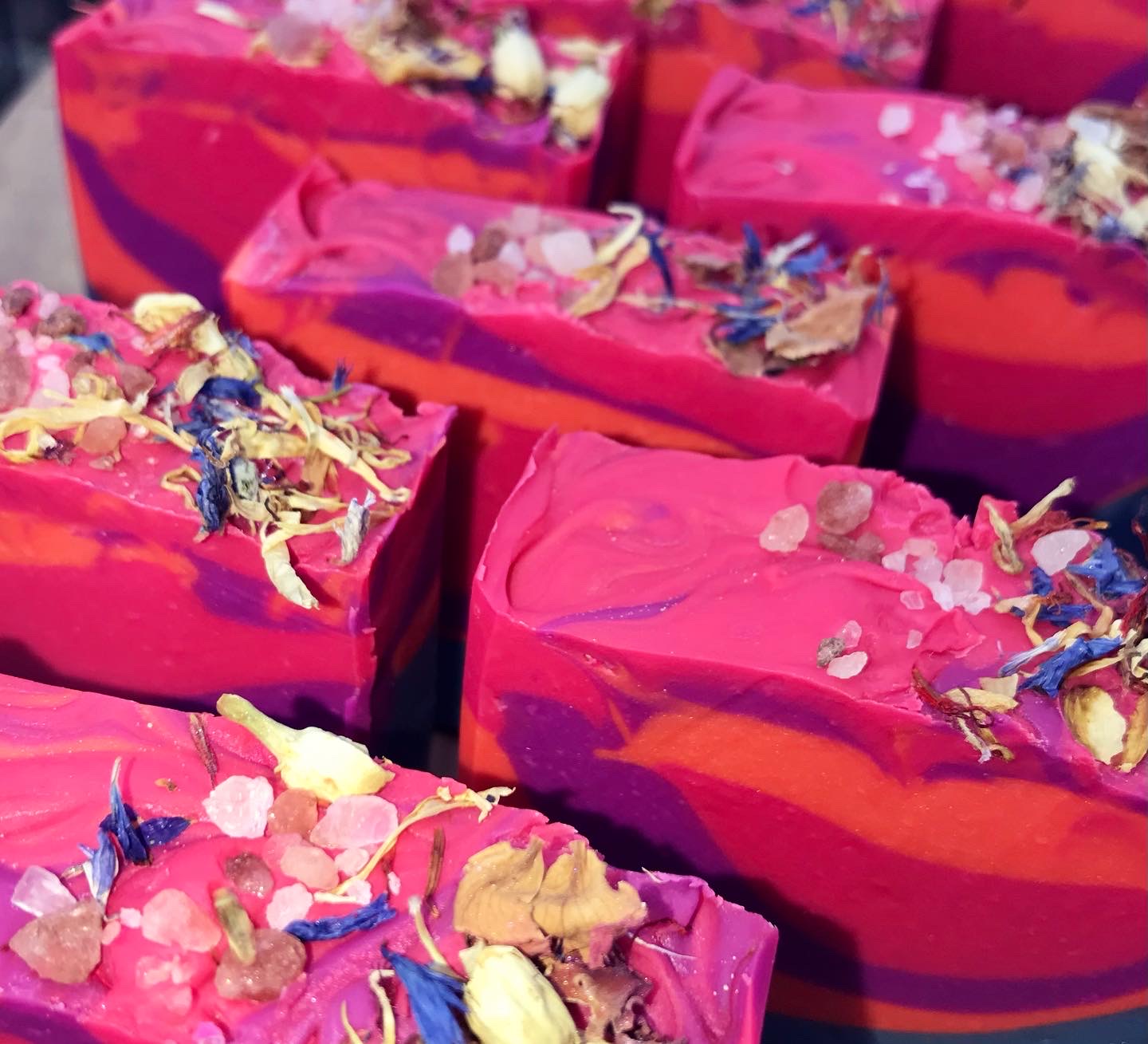 Ingredients: organic coconut oil, organic sustainable palm oil, grapeseed oil, canola oil, olive oil, distilled water, palm kernel flakes, sodium hydroxide, sunflower oil, sodium lactate, fragrance, kaolin clay, body safe oxide colorant, dried flowers, pink Himalayan salt