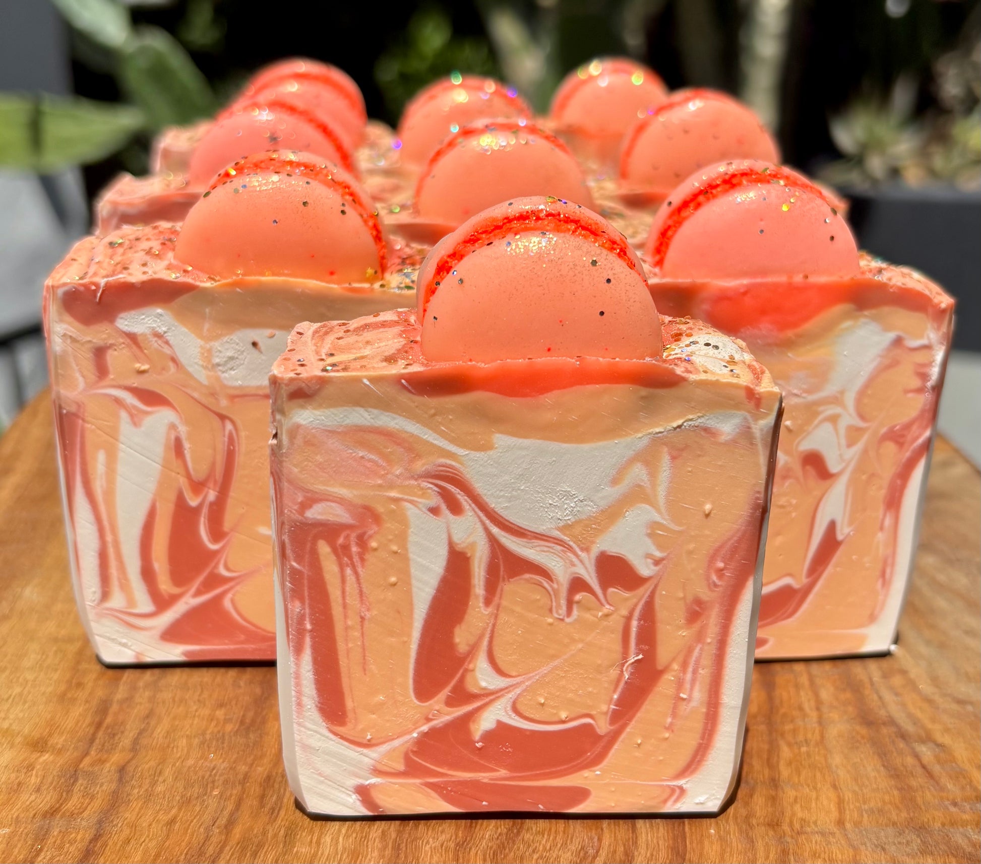 Rediscover the joy of childhood summers with our Artisan Orange Creamcicle Macaron Soap. Handcrafted with care, this luxurious soap is made with organic coconut and olive oils, creating a rich, creamy lather that gently cleanses and deeply nourishes your skin. The delightful blend of orange sherbet and vanilla ice cream fragrances brings a sweet, nostalgic scent that evokes memories of carefree days and refreshing treats.