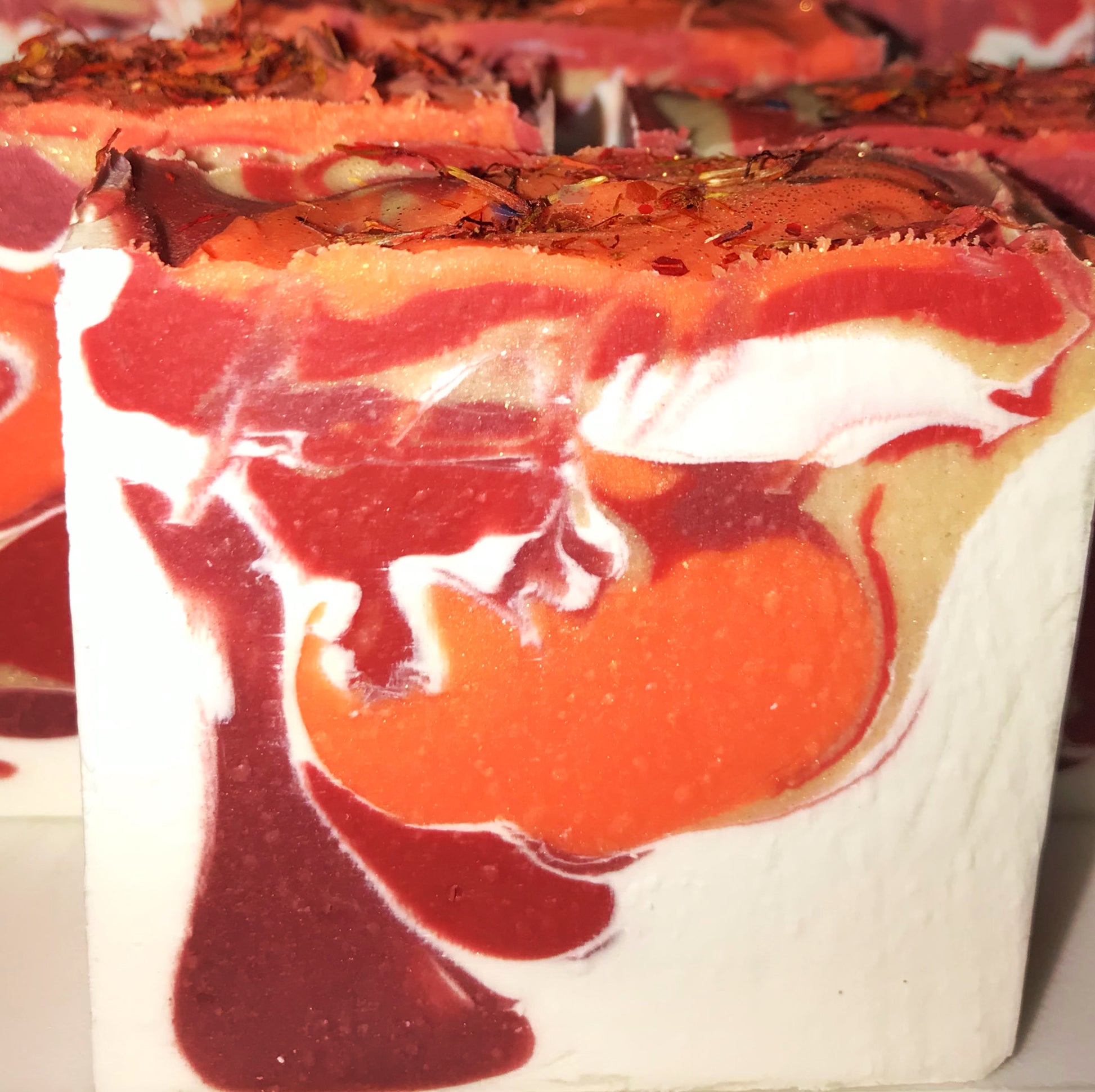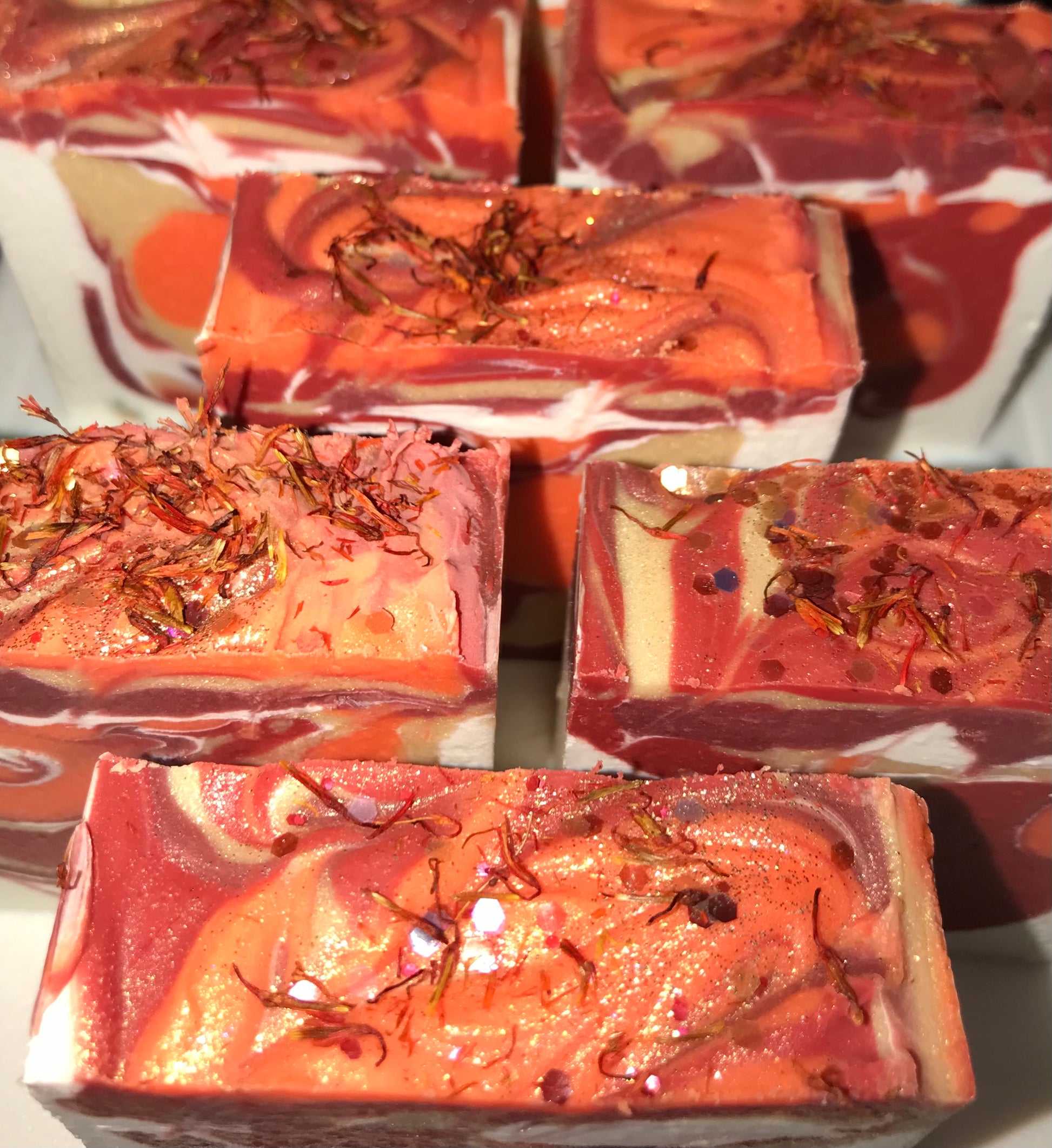 Ingredients: organic coconut oil, organic sustainable palm oil, canola oil, olive oil, castor oil, vitamin e, sodium hydroxide, sodium lactate, fragrance, body safe oxide colorant, mica, dried flowers, biodegradable glitter