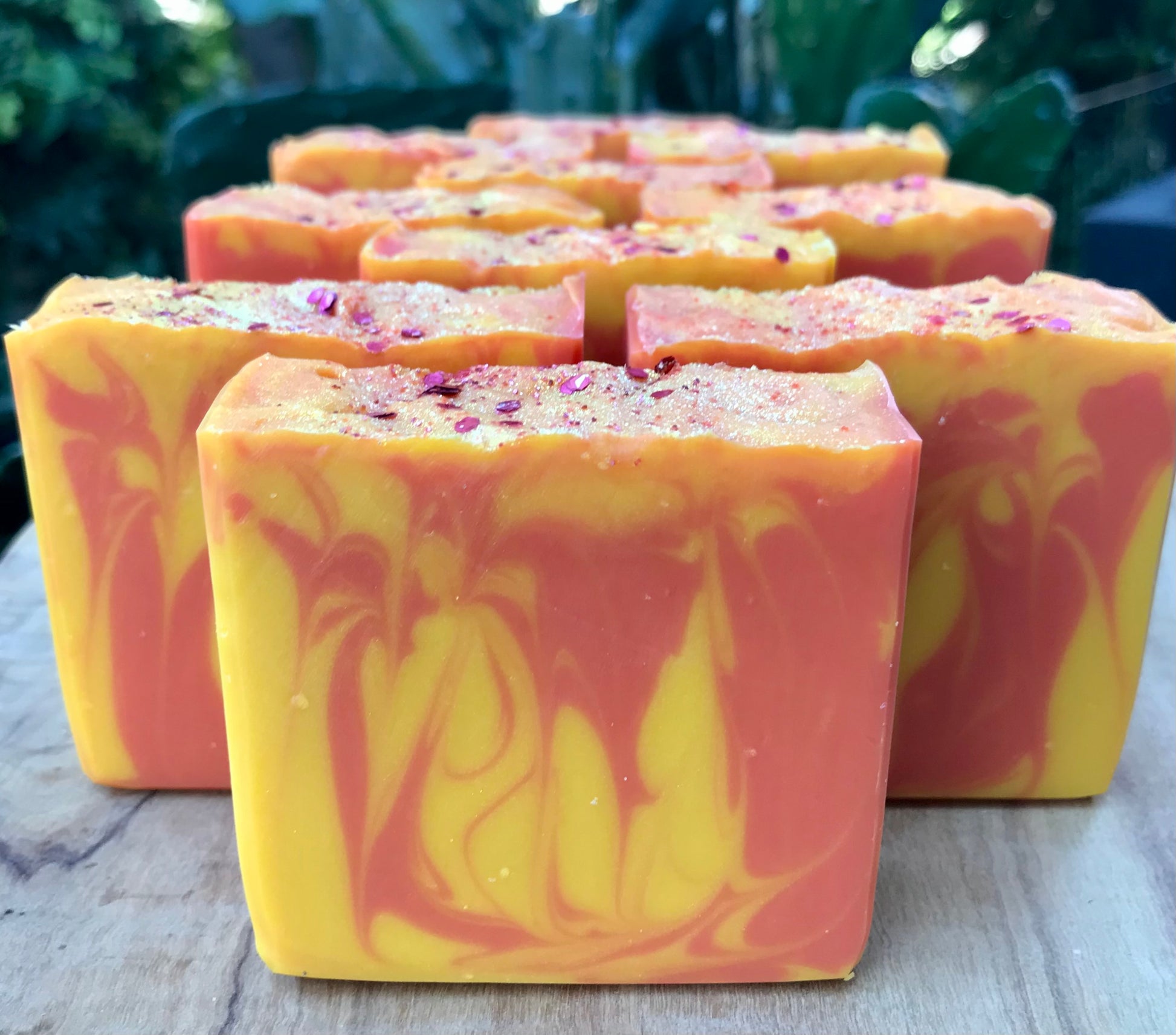 Ingredients: organic coconut oil, canola oil, sustainably sourced organic red palm oil, olive oil, distilled water, sodium hydroxide, grapeseed oil, avocado oil, fragrance, cocoa butter, sodium lactate, kaolin clay, mica, biodegradable glitter