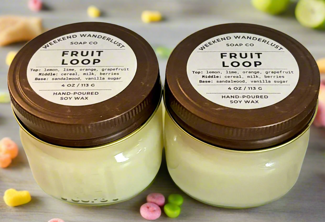 Dive into the playful, nostalgic scent of our Fruit Loops fragrance. This vibrant blend of lemon rinds, lime, grapefruit, lemongrass, lily, verbena, and vanilla sugar captures the joyful essence of childhood breakfasts, where the air is filled with the sweet and zesty aroma of your favorite fruity cereal.