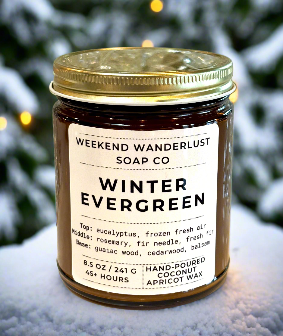 Embrace the festive magic with our Winter Evergreen fragrance. This scent captures the essence of the holiday season, combining the refreshing notes of eucalyptus and frozen fresh air with the comforting aroma of fir sprigs and fresh fir. Accented with rosemary, fir needle, guaiac wood, cedarwood, and wooded balsam, this fragrance will make you want to grab a cup of hot cocoa and sit by the fire.